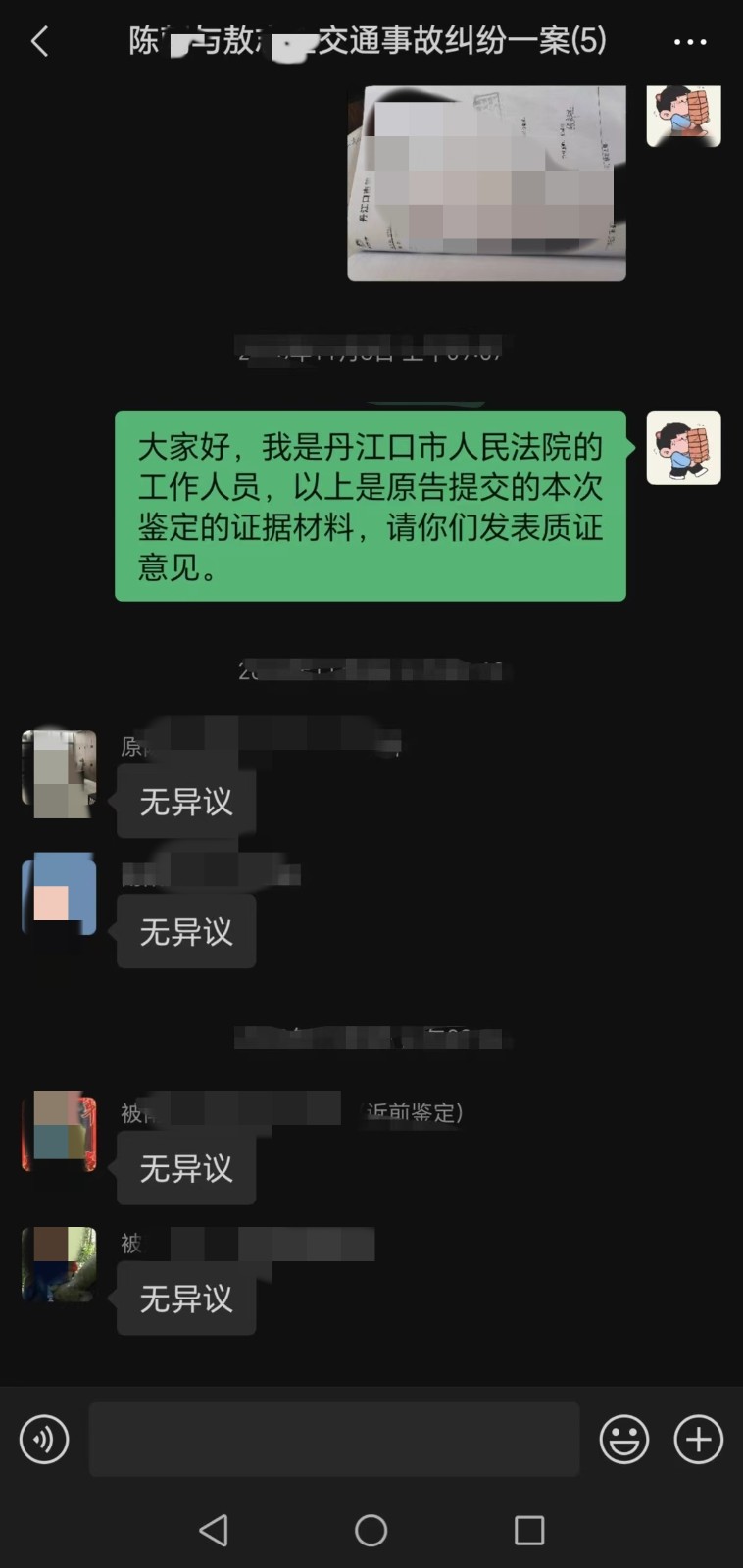 在案件审查阶段,浪河法庭认为该案具备调解基础,遂向当事人释明了诉前鉴定的优点及运行流程,在征得双方当事人同意后,联系并组织原、被告签订“共同委托诉前鉴定申请书”及“诉前调解申请书”,积极推动诉前鉴定程序。为切实减轻当事人诉累,实质性化解矛盾纠纷,浪河法庭第一时间组织原、被告通过“微信群发布质证材料”“腾讯视频组织质证”等方式开展诉前鉴定前置程序,并在当天将鉴定所需全部材料报送市法院司法技术室予以委托。